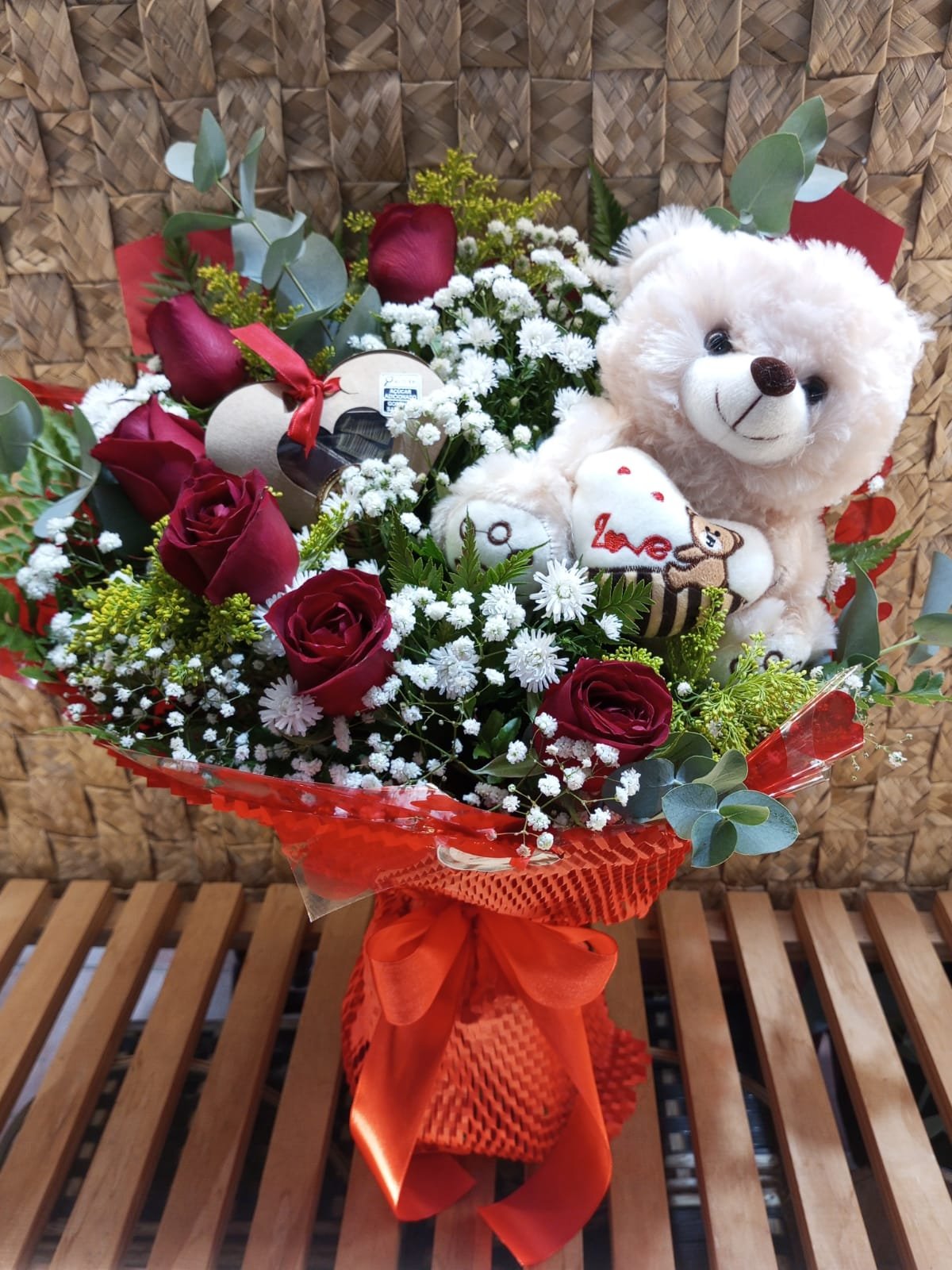 BUQUÊ COM 06 ROSAS,URSO E CHOCOLATE